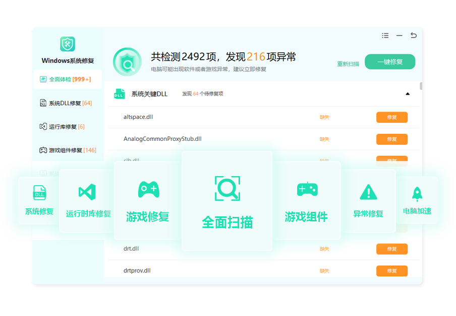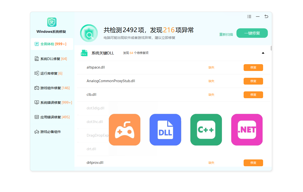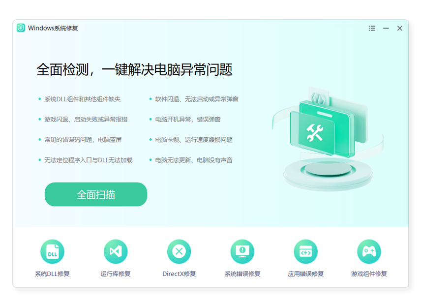 一键修复电脑因系统文件、DLL、DirectX导致的 崩溃、卡顿、故障 等问题